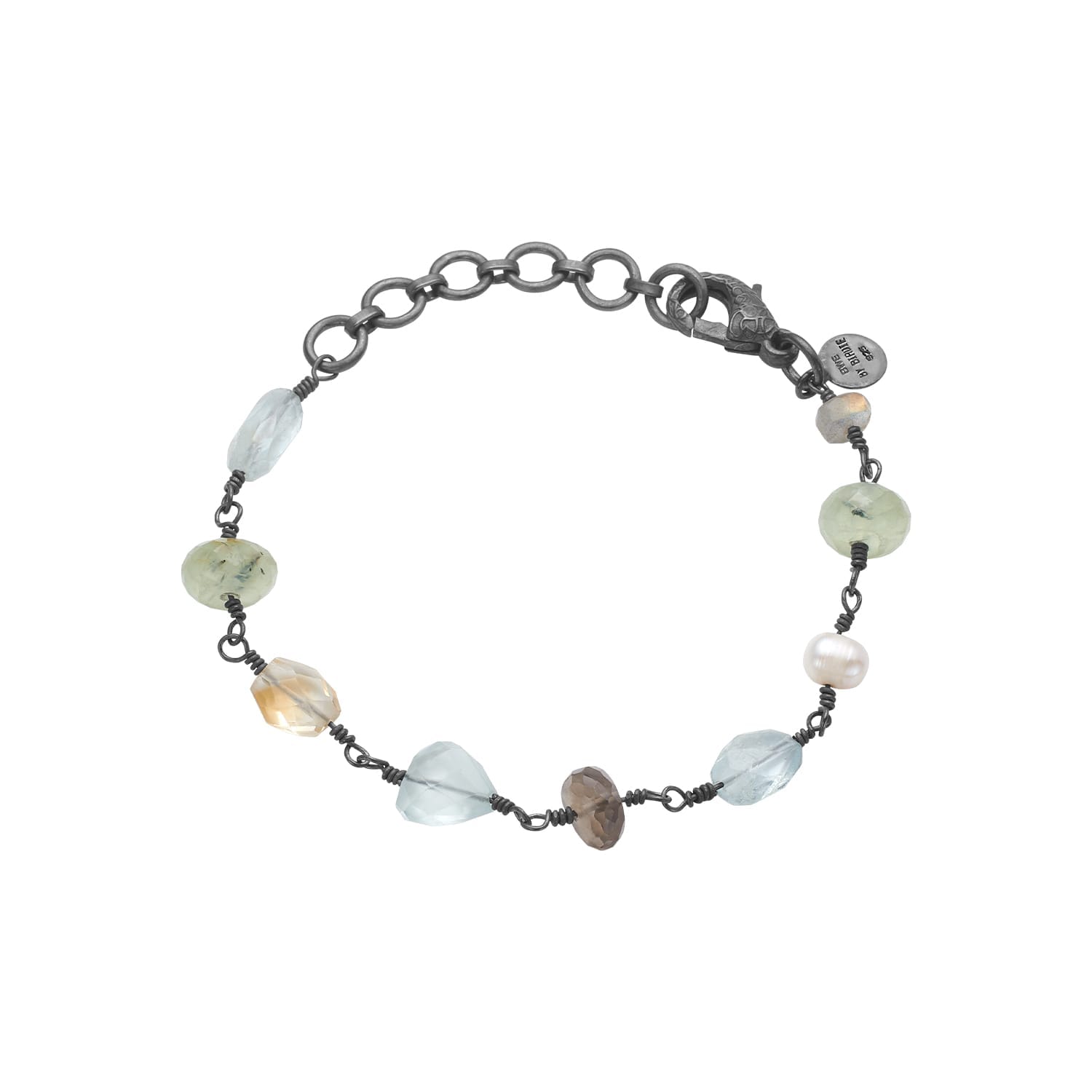 Fra venstre ses følgende sten: Akvamarin, Prehnit, Rutil Kvarts, Akvamarin, Røg kvarts, Akvamarin, Ferskvandsperle, Prehnit og Labradorit.