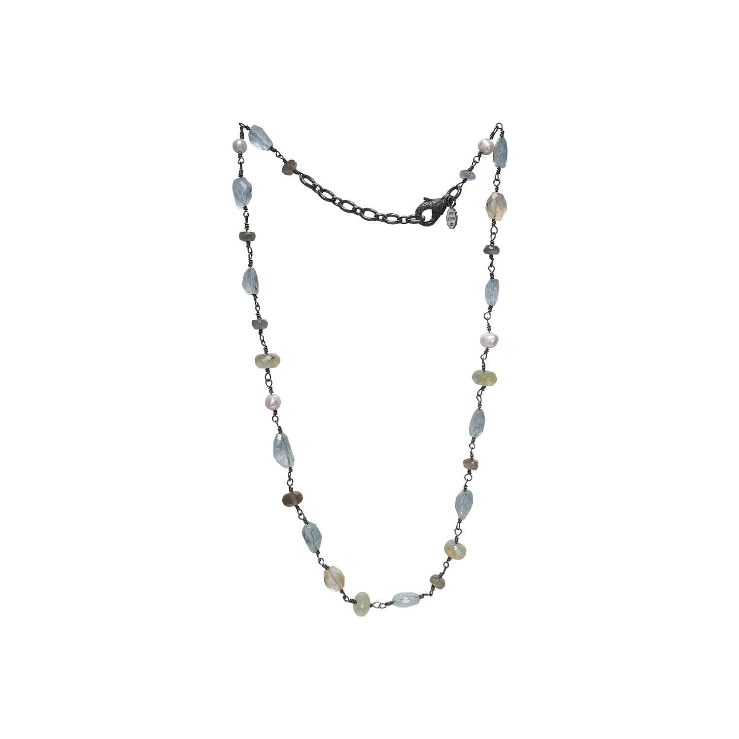Halskæden er lavet med stenene: Akvamarin, Prehnit, Citrin, Røg Kvarts, Ferskvandsperle, Labradorit.