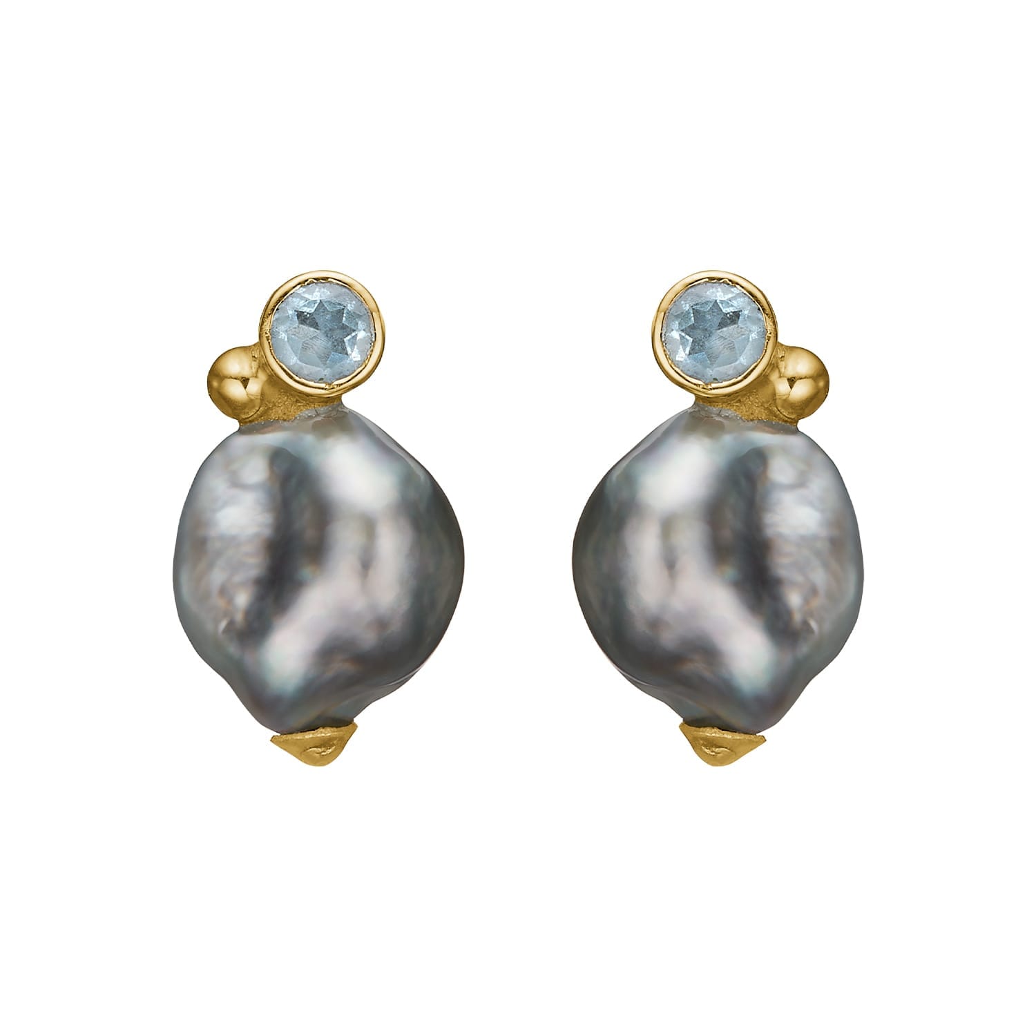 Øreringe med grå keshi perle og blå akvamarin sten – Ørestikkerne Naja Aqua Grå Keshi, er lavet af en 14 karat guldkugle og guldfatning, der indkapsler en blå akvamarin, hvorfra der hænger en grå tahiti keshi perle i en guld trådvikling. Ørestikkerne måler ca. 11-13mm.