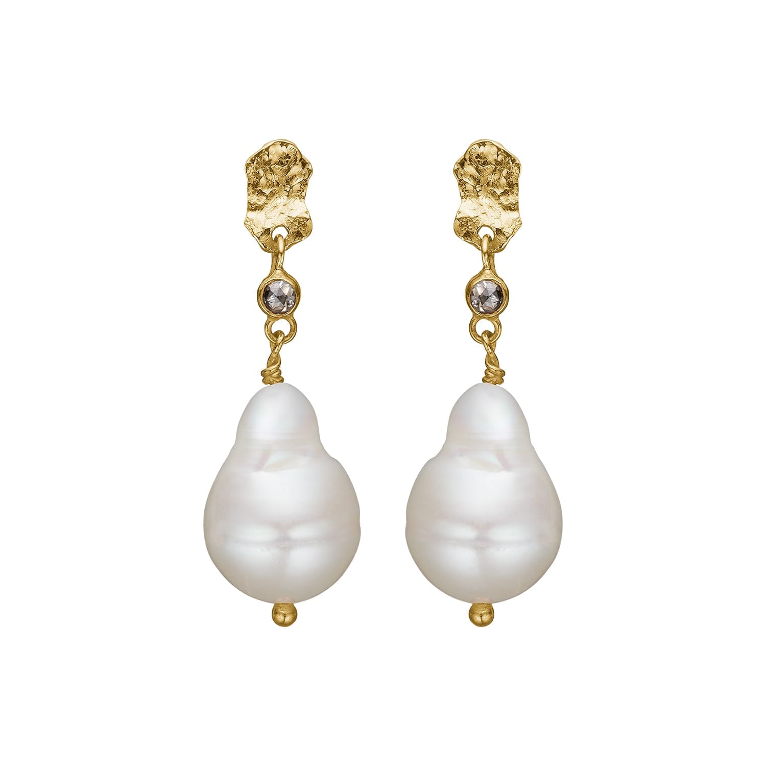 Guld øreringe med perle og diamant – Naja Pearl, er formet af en hammerslået 14 karat guldplade, hvorfra to rosenslebne diamanter (0,12ct i alt) hænger i en guldfatning. Fuldendt af en større barok hvid ferskvandsperle. Der sidder et sølv ørespyd på øreringene.