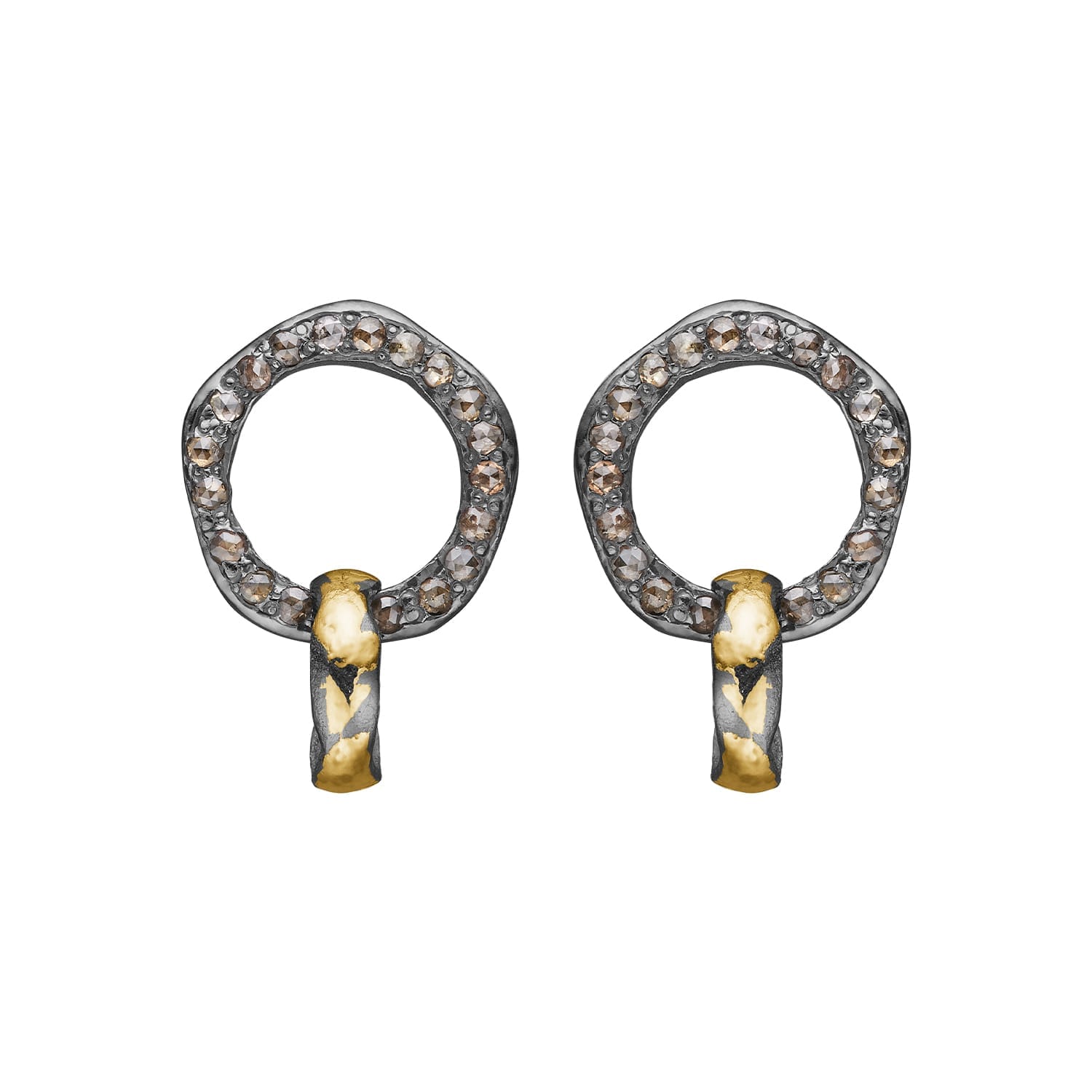 Diamant øreringe til kvinder – Onassis Duo Circle øreringene er lavet af sterling sølv. Den øverste del af ørepynten er prydet med rosenslebne diamanter der sidder i pavé (0.88ct i alt). Herpå sidder et led af sterlingsølv, som er pyntet med påloddet 18 karat guld.