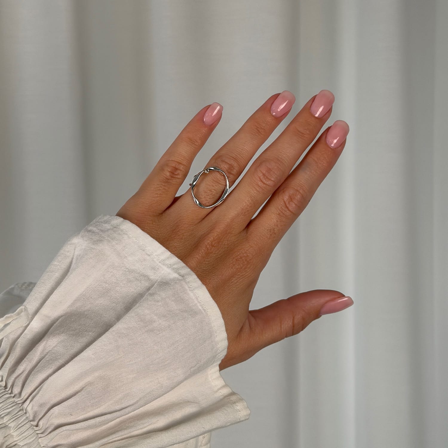 Lotus Oval Ring er en særlig og iøjnefaldende ring fra By Birdies Lotus kollektion. Ringen består af to parallelle ringskinner i 925 sterling sølv, der elegant omslutter en snoet oval sølvtråd i toppen. Denne lethed og kompleksitet i opbygningen skaber et skulpturelt udtryk med balance og bevægelse.