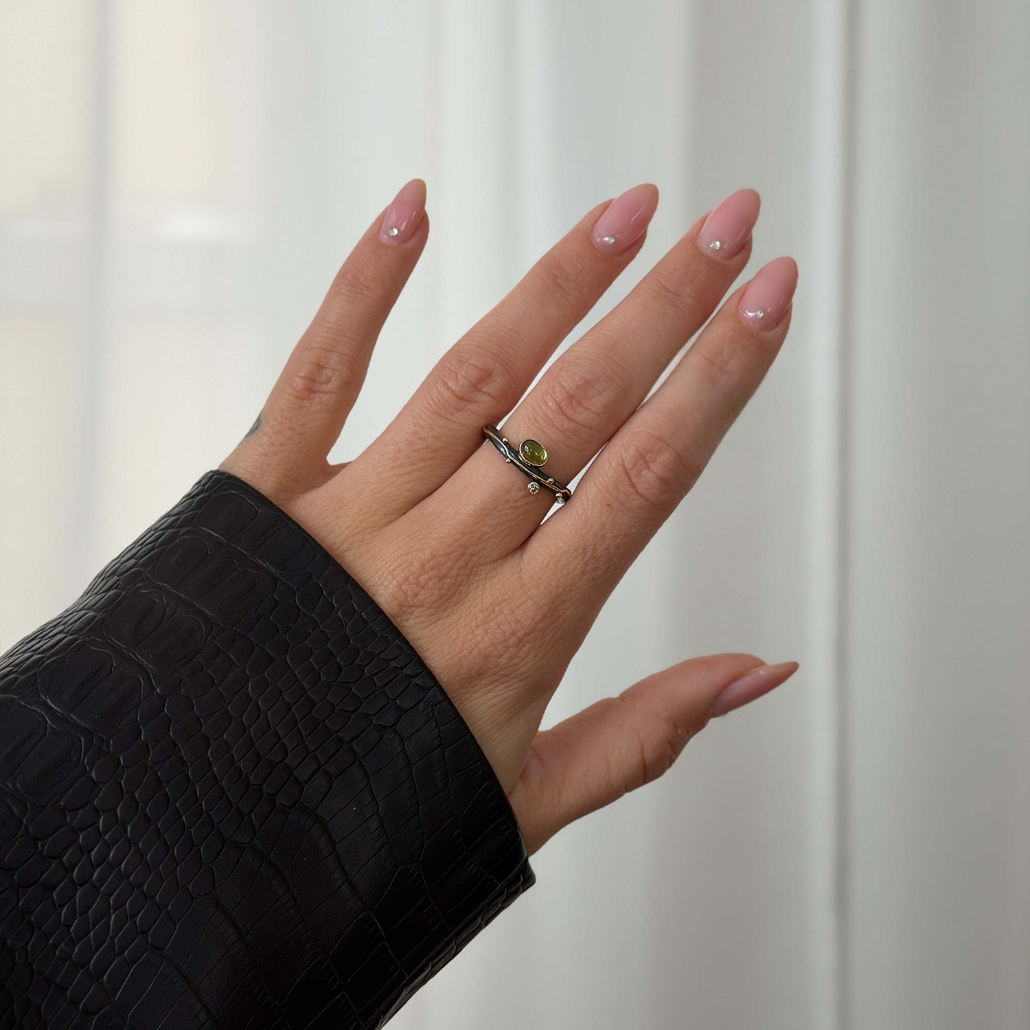 Louise Peridot er en ring for kvinden, der ønsker et smykke med personlighed, ro og farvebalance. Den er en del af Zeus-kollektionen og Queen’s Collection – to kollektioner, der forener råt nordisk håndværk med feminin styrke og kongelig elegance.