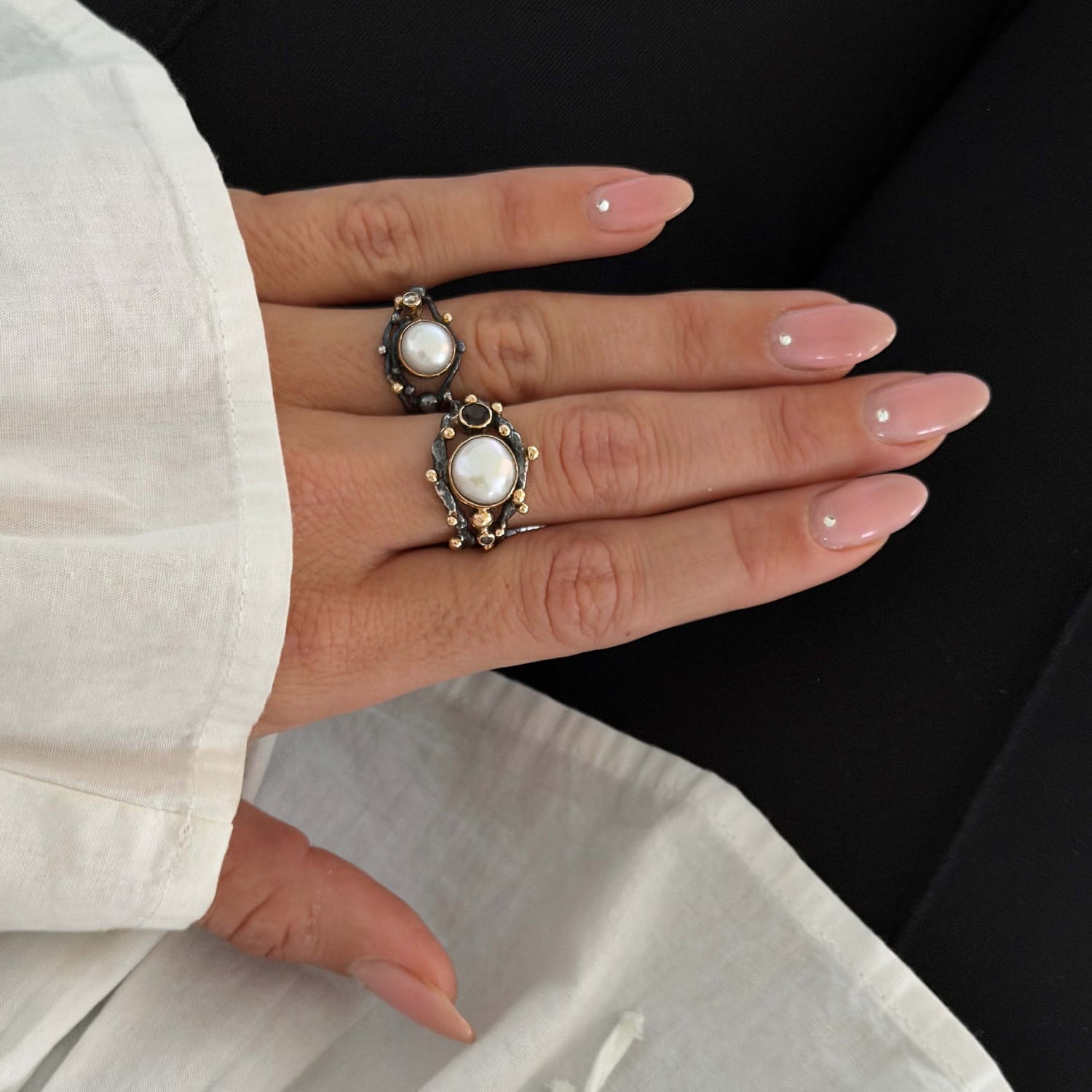 Denne kunstfærdige ring er håndlavet af 925 sterling sølv, som er oxideret for at skabe en dyb, rig farve, der står i smuk kontrast til det glimtende 14 karat guld og de funklende diamanter. To organiske ringskinner, elegant formet og prydet med 14 karat guldkugler, skaber en harmonisk ramme, der blidt omfavner en hvid ferskvands keshi perle.