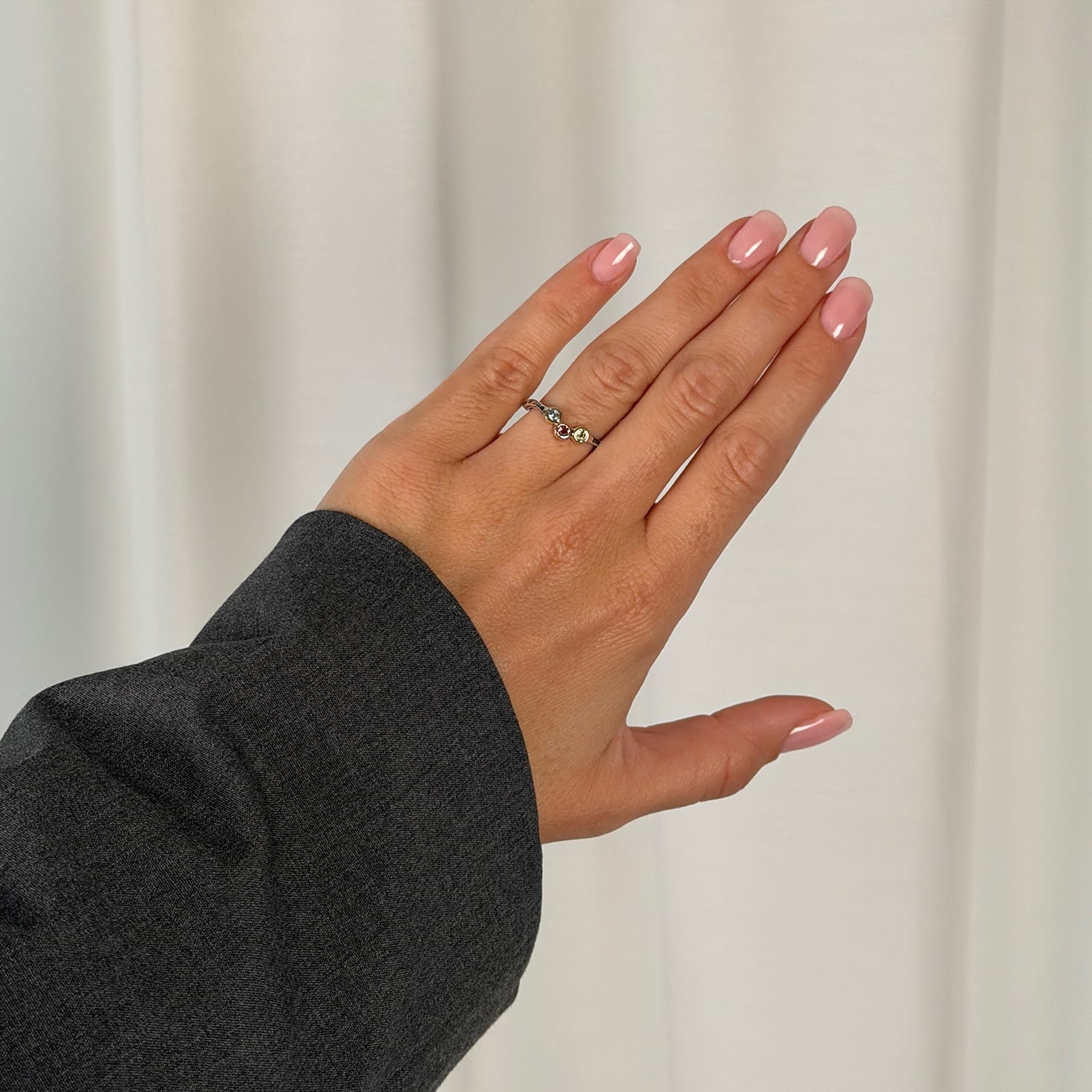 Sølvring med farvede ædelsten. Grace Single-3 Garden, er lavet af en snoet og irregulær ringskinne i sølv, der forbindes med tre 14 karat guldfatninger, der indfatter en blå akvamarin, grøn peridot og en rød turmalin.