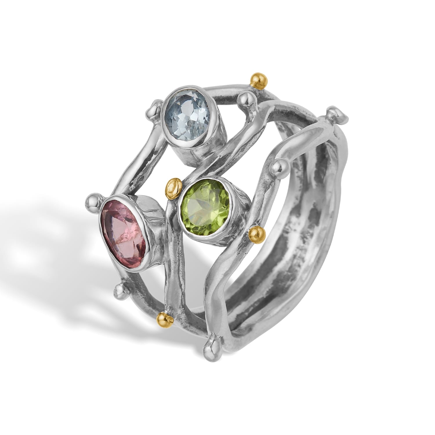 Grace Triple Garden, er den nytilkomne variant af vores Ring Grace Triple Ocean. Ringen er lavet af tre ringskinner i 925 sterling sølv, pyntet med 14 karat guldkugler, herudover en blå akvamarin, en grøn og en rød turmalin indfattet i 14 karat guld fatninger.