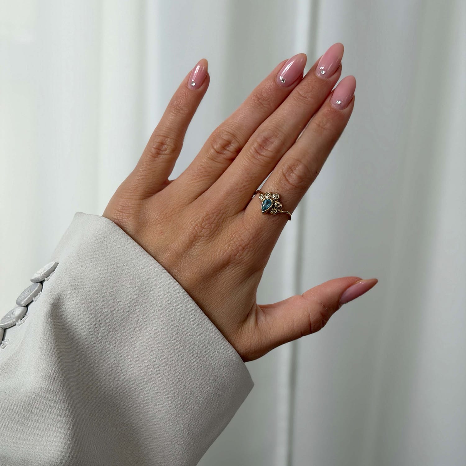 I centrum sidder en smuk, facetteret akvamarin i pæreslib, hvis himmelblå nuancer bringer ro og klarhed. Rundt om stenen svæver fem brillantslebne diamanter (0.17 ct i alt), placeret i en harmonisk formation, der forstærker ringens symbolske og spirituelle udtryk.
