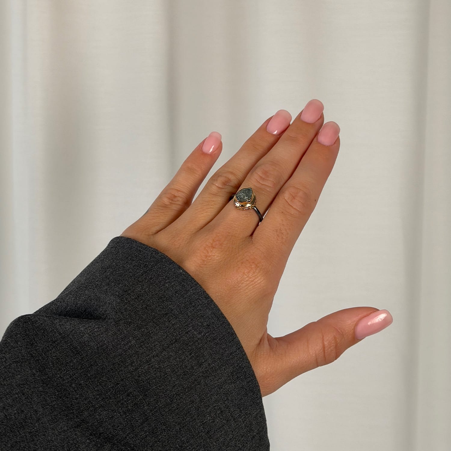 Mary Aqua Raw, ring med rå akvamarin – En flot cocktail og hverdags ring, lavet i oxideret sterling sølv med 14 karat guld fatning, der huser den rå akvamarin, samt diamanter sat i pavé hele vejen rundt om akvamarinen.