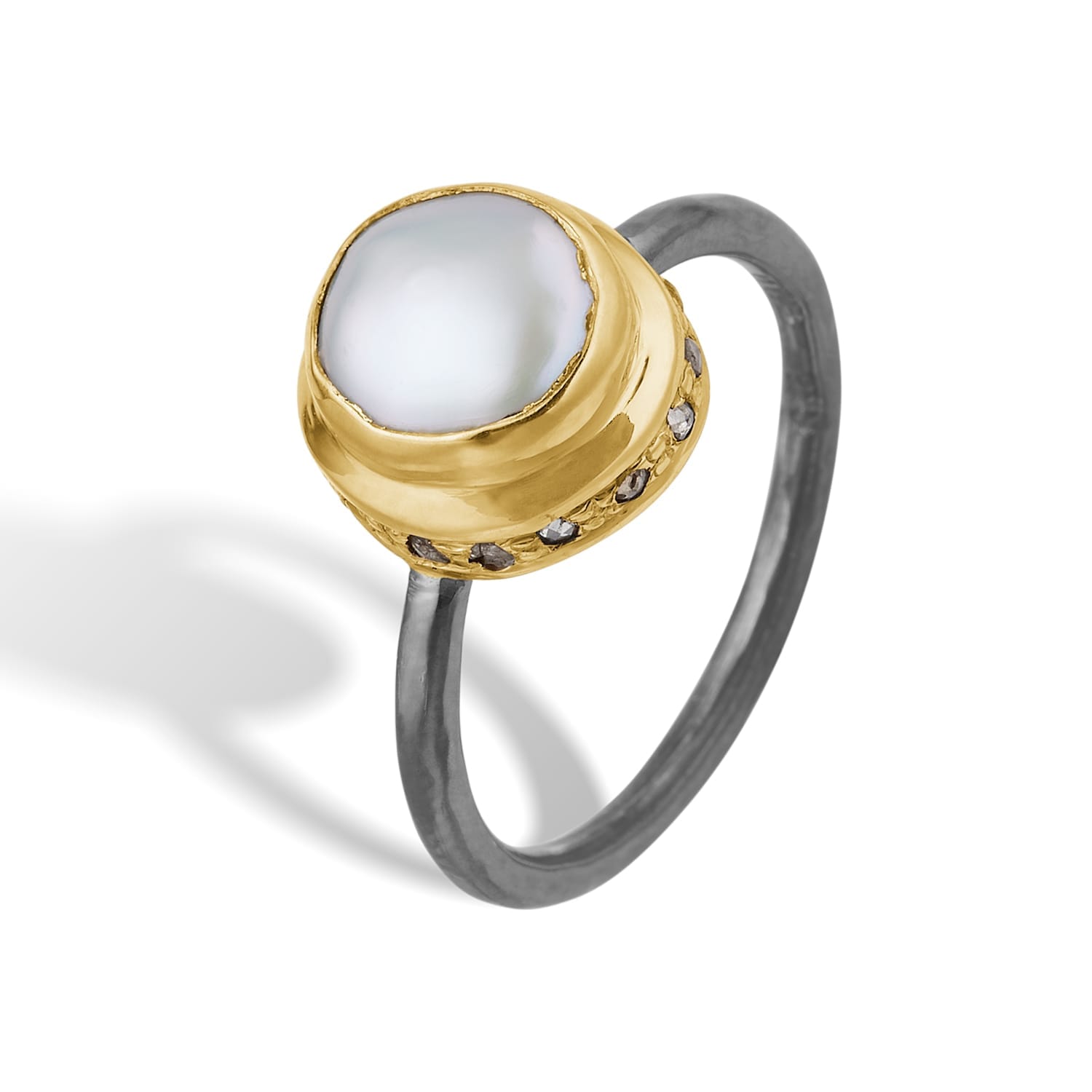 Sølv perle ring, med en hvid ferskvands keshi perle. Ringskinnen er lavet i sterling sølv, som er oxideret – denne slutter sig op om 14 karat guld fatning der indfatter den hvide keshi perle og rosenslebne diamanter hele vejen rundt om fatningen.