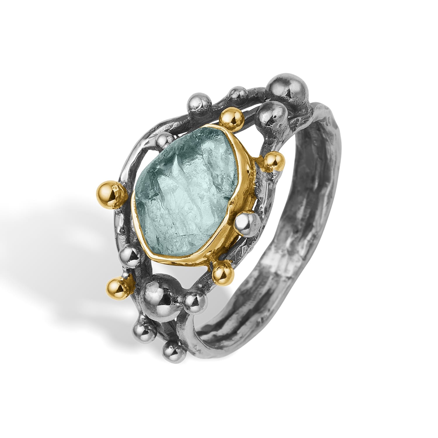 Sølvring med rå blå sten. Urban Harlem Buds Aqua Raw. Ringen er pyntet med 14 karat guld kugler og en blå rå akvamarin indfattet i 14 karat guld.