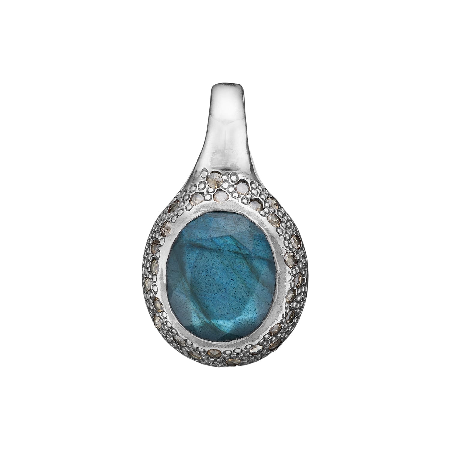 Sølv vedhænget Frida Pavé Labradorite, er lavet af 925 sterling sølv, med indfattede rosenslebne diamanter (0.48ct i alt), som omkranser den store flotte labradorit sten. Vedhænget måler ca. 26x15mm