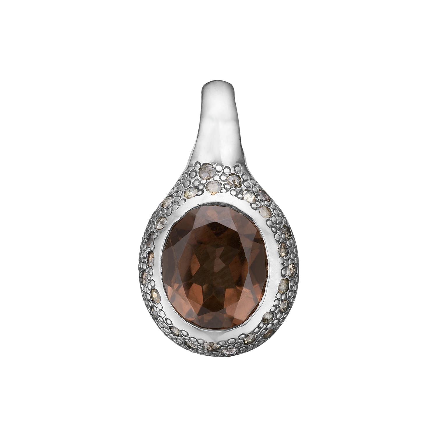 Sølv vedhænget Frida Pavé Smoky Quartz, er et vedhæng af sterling sølv, pyntet med pavé indfattede rosenslebne diamanter (0.48ct i alt), som omslutter sig den store flotte røg kvarts sten. Vedhænget måler ca. 26x15mm